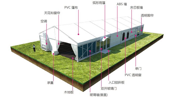 產(chǎn)品優(yōu)勢.外觀簡潔大方. 內(nèi)無支柱,百分百利用空間.可選配套設施,可加照明、排水、防撞、地臺、空調(diào)、發(fā)光燈箱、墻體、門等系統(tǒng).鋁合金輕便,安裝拆卸方便快捷.廣泛應用于展會、售樓處、倉儲、景區(qū)、酒店、夜市等。